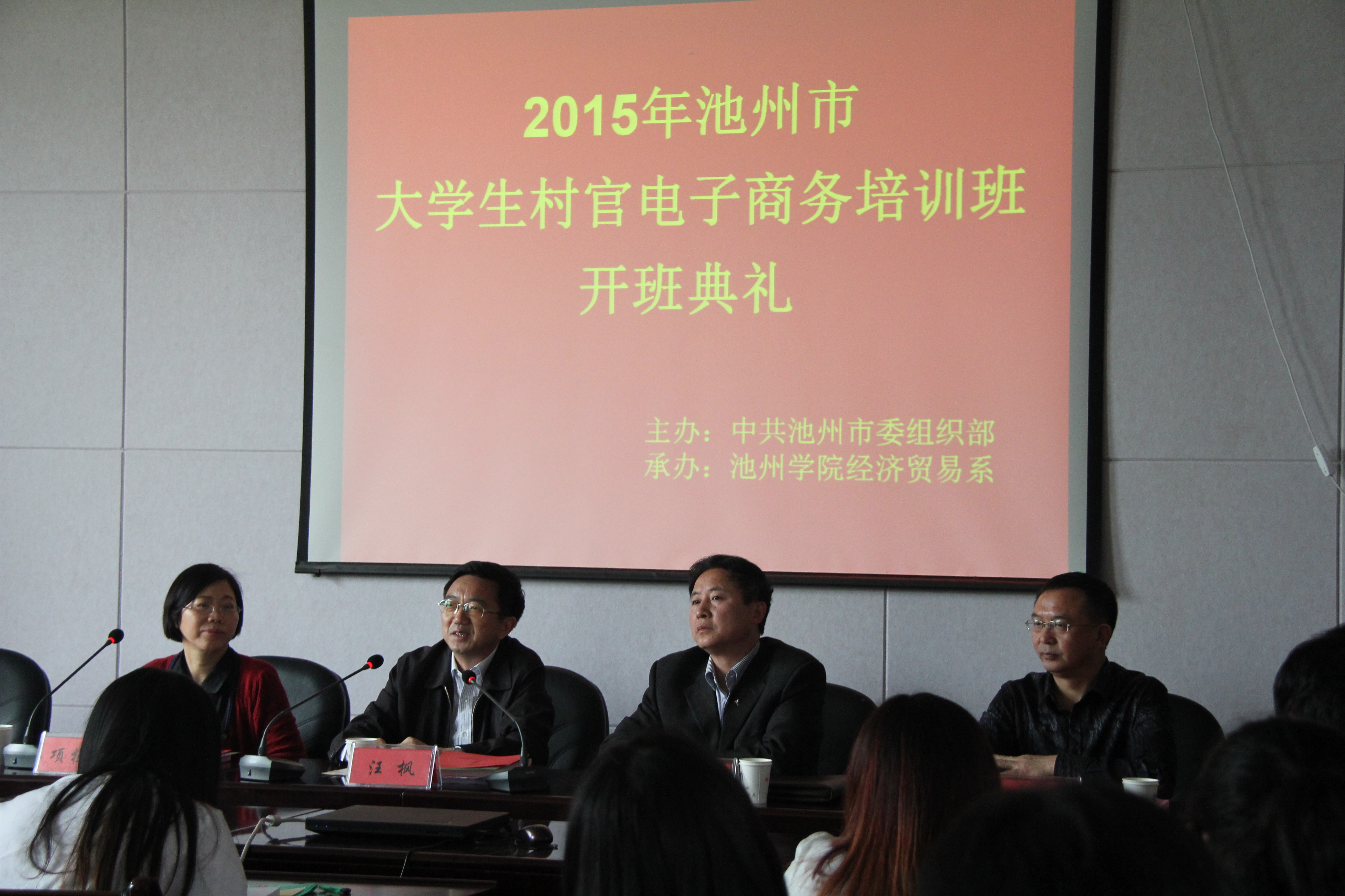 4月27日上午,池州市老员工村官电子商务培训班开班典礼在太阳成集团122ccvip经济贸易系会议室举行。公司党委副书记汪枫、池州市委组织部副部长施慧春、干部教育科科长姜秀丰、经济贸易系领导班子成员及60名学员出席开班典礼。