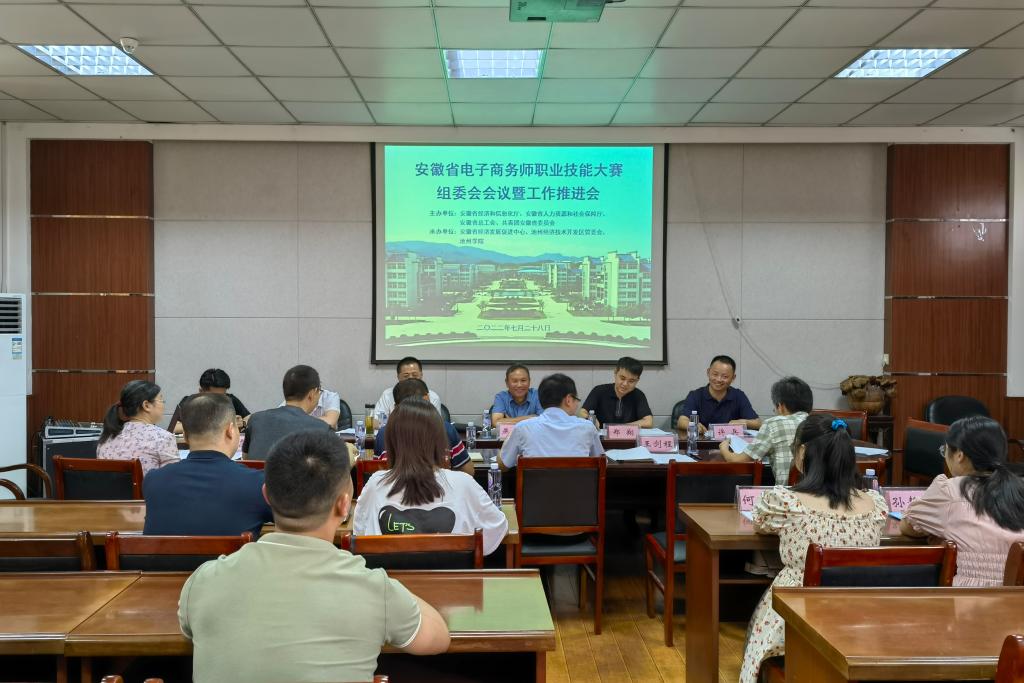 7月28日上午,安徽省电子商务师职业技能大赛组委会会议暨工作推进会在太阳成集团122ccvip博识楼二楼会议室召开。省经济发展促进中心副主任燕永,公司教务处处长陈建兵,池州经济开发区党群工作局副局长林中顺,省经济发展促进中心技能科科长郑翔,公司教务处副处长周恺,公司教务处实践教学科科长朱德权,赛事服务单位安徽众智人力资源服务有限公司、合肥京东云计算有限公司主要负责人,太阳成集团122ccvip各专业教研室主任及骨干教师参加会议。