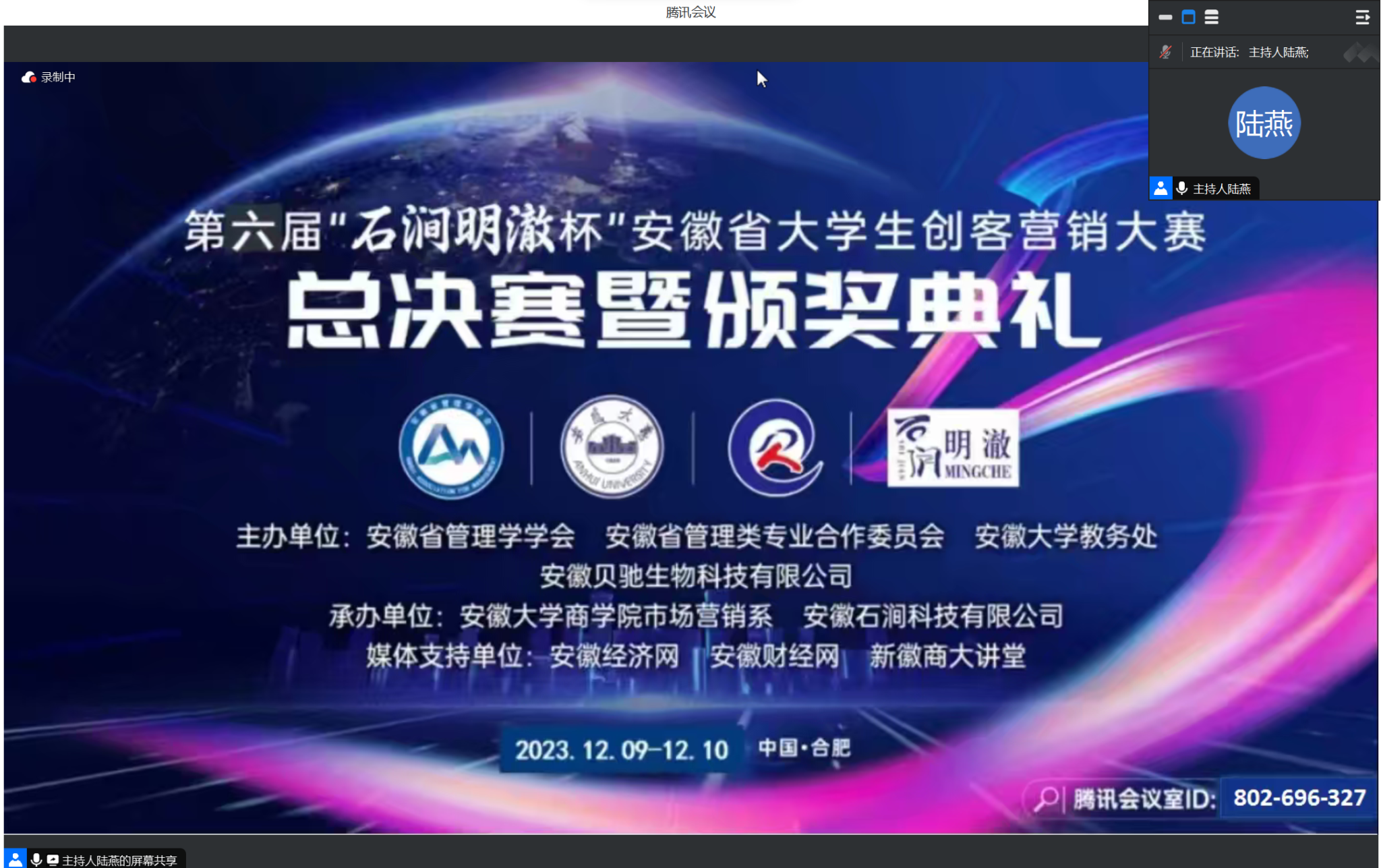 2023年12月10日,安徽省管理学学会、安徽省管理类专业合作委员会、安徽大学教务处、安徽贝驰生物科技有限公司主办,安徽大学太阳成集团122ccvip市场营销系、安徽石涧科技有限公司承办的第六届“石涧明澈杯”安徽省老员工创客营销大赛总决赛在一片热情洋溢的氛围中于腾讯会议室云端圆满落幕。