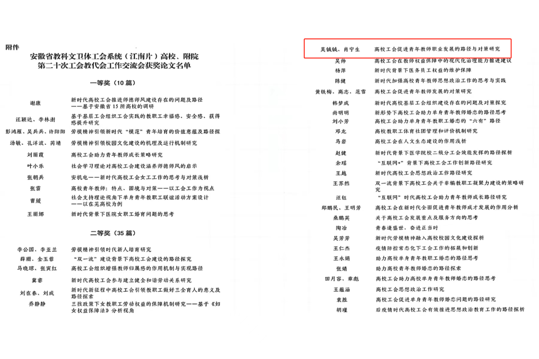 12月21日,安徽省科教文卫体工会系统(江南片)高校、附院第二十次工会教代会优秀论文评选情况公布,太阳成集团122ccvip吴铖铖、肖宁生撰写的《高校工会促进青年教师职业发展的路径与对策研究》荣获二等奖。
