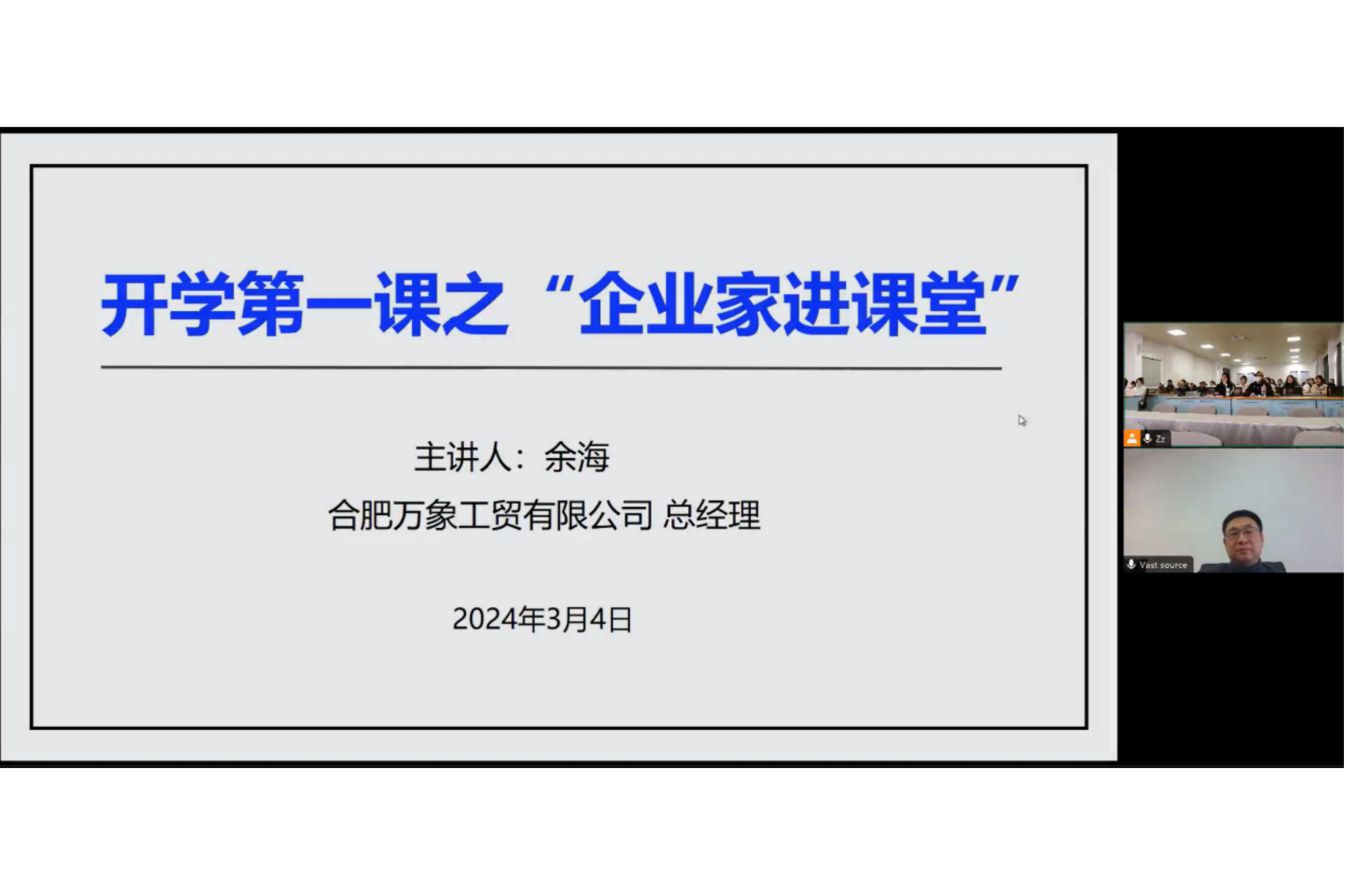 3月4日,太阳成集团122ccvip2021级国际经济与贸易专业员工迎来了一次别开生面的开学第一课,本次课程由合肥万象工贸有限公司余海总经理在线上进行了一次开放式教学活动。