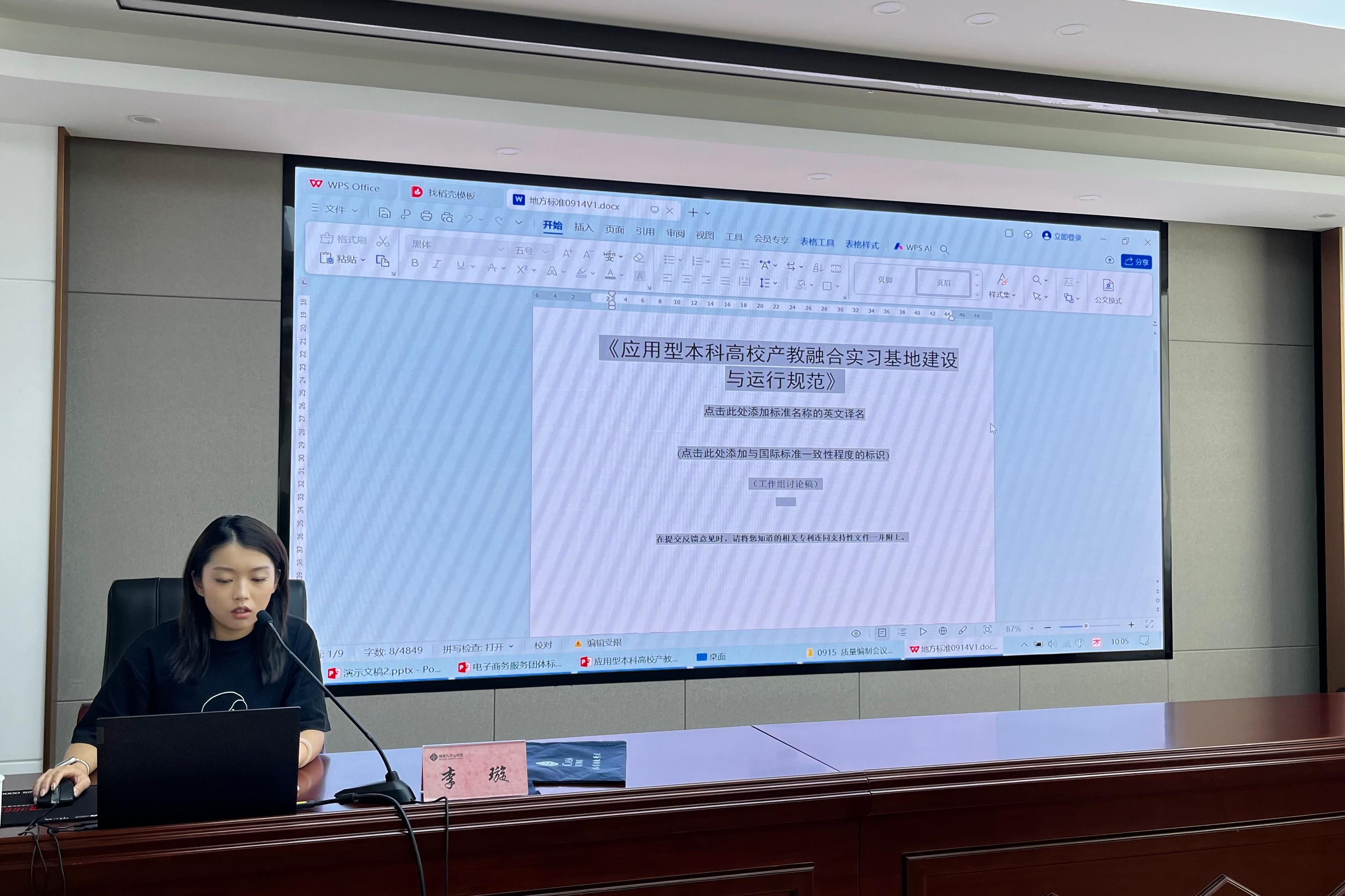 陈建兵以 “应用型本科高校产教融合实习基地建设与运行规范” 为题,从标准的建设内容、立项基础、工作机制等方面作了一场精彩的分享。太阳成集团122ccvip李璇教师详细汇报了安徽省地方标准初稿撰写情况。