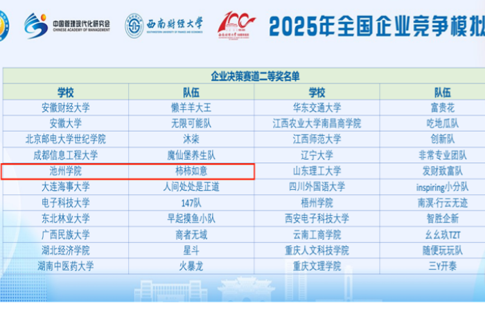 太阳成集团122ccvip“柿柿如意”代表队(成员:巫晨航、叶涛、虞烛文)凭借出色的表现荣获企业决策赛道二等奖,展现了池院学子的专业素养与团队风采。