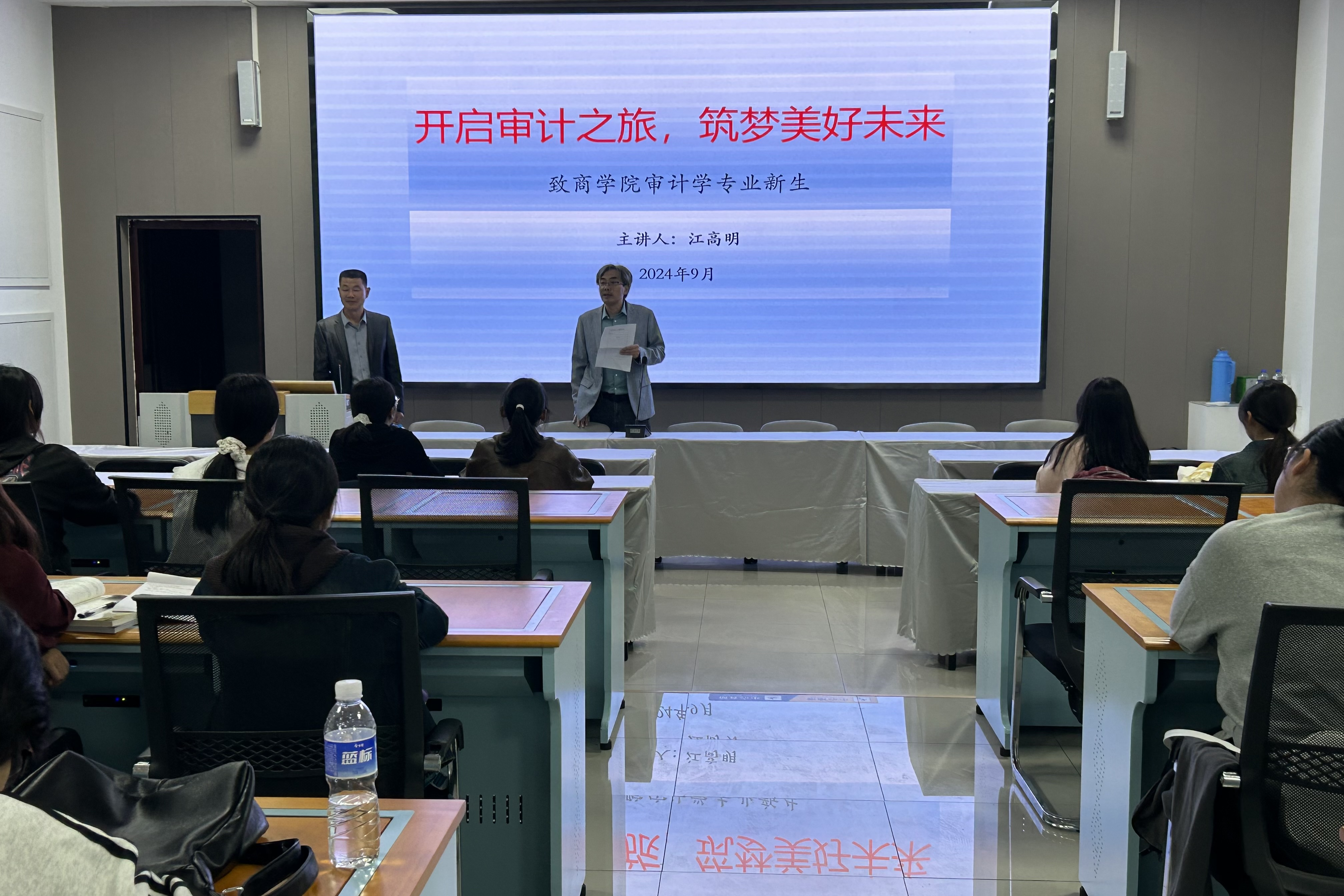 为使同学们更加深入的了解审计行业发展前景,积极做好大学学习生涯及职业生涯规划,审计学教研室于10月10日召开2024级审计学专业导论。本次活动由审计学教研室主任吴铖铖主持,诚邀池州市贵池区审计局江高明局长、2021级审计学2班高倩倩同学主讲,2024级审计学专业全体同学参加。