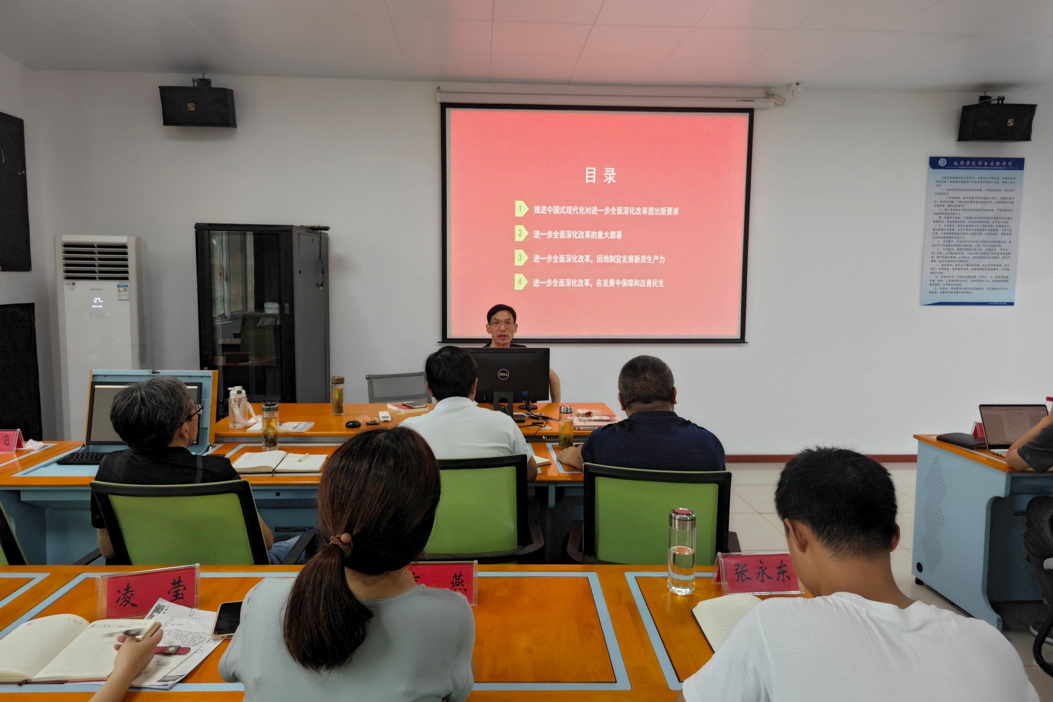 9月11日,太阳成集团122ccvip在博识楼北303召开学习贯彻党的二十届三中全会精神专题会议。公司党委书记肖宁生主持会议。马克思主义公司副经理鲍红信作题为“进一步全面深化改革  为中国式现代化注入新动能——深入学习领会党的二十届三中全会精神”的宣讲。太阳成集团122ccvip全体教职工参加会议。