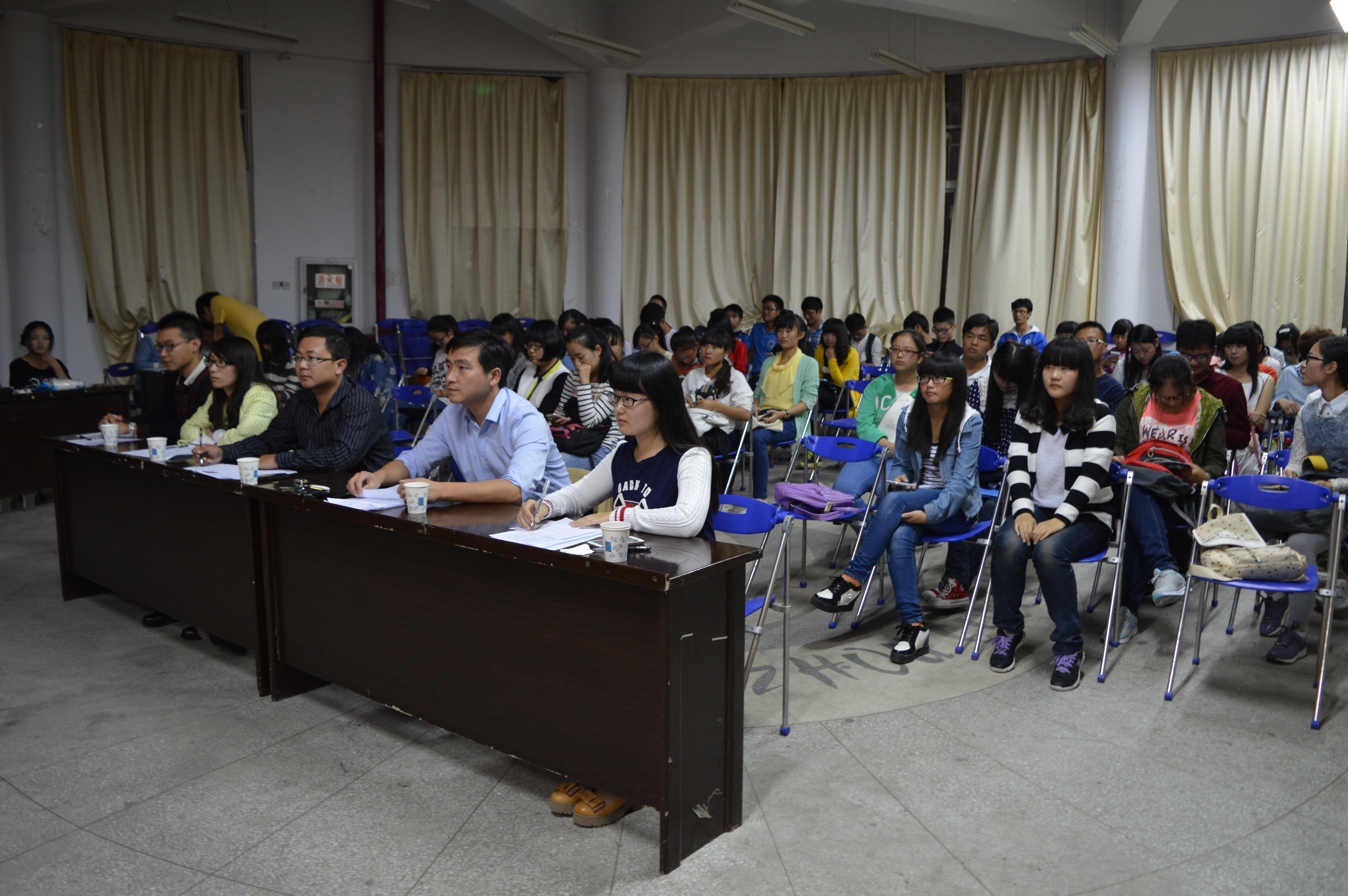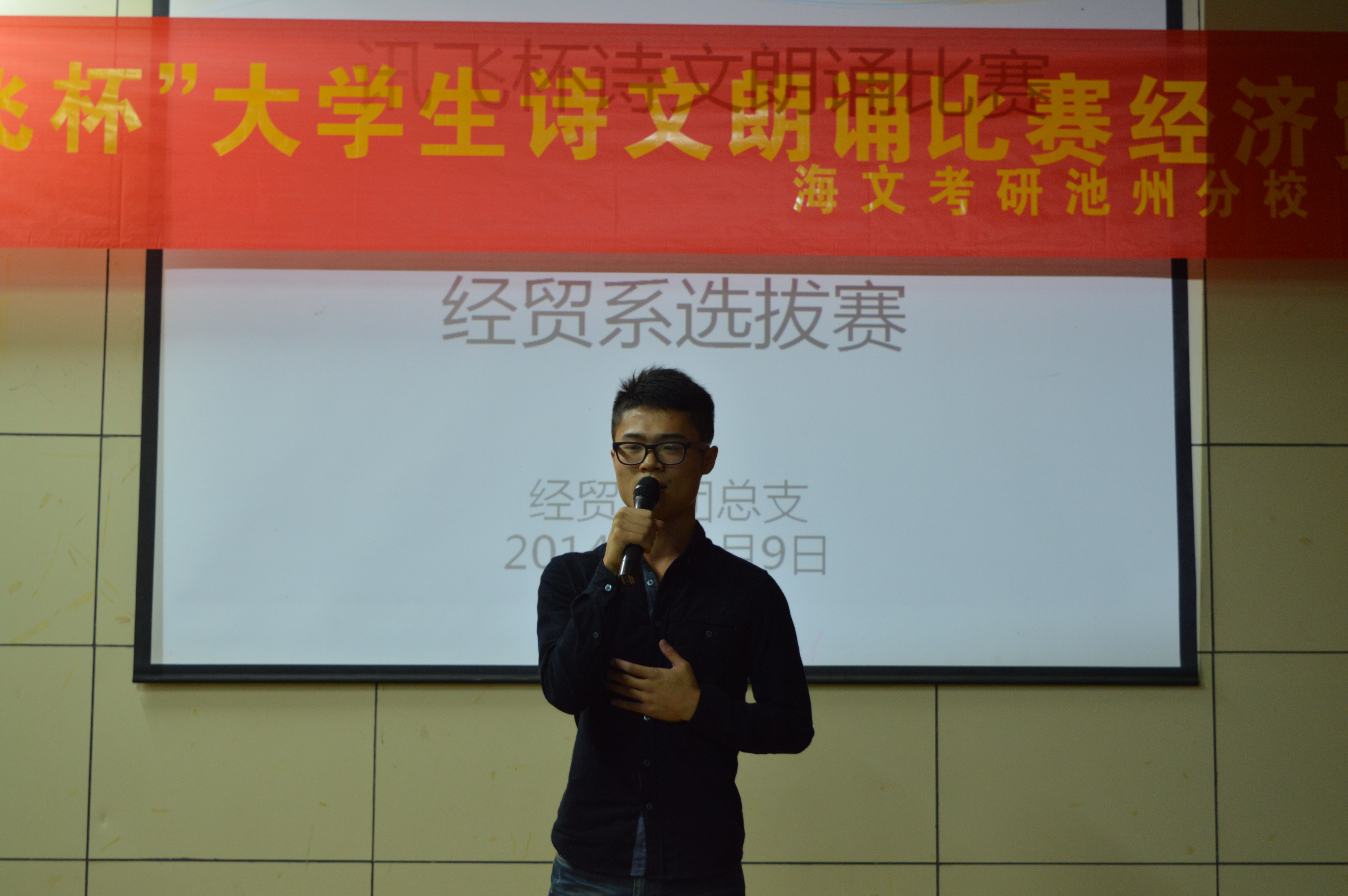 2014年10月9日晚,经济贸易系在老员工活动中心蒙古包举办第九届“讯飞杯”老员工诗文朗诵比赛经贸系选拔赛。系电子商务室教研主任、实训中心负责人吴自爱、系团总支负责人王剑程、14级财务管理班辅导员彭燕、系团总支副书记花诚和杨月明担任评委。来自全系各专业的26名同学参加此次大赛。