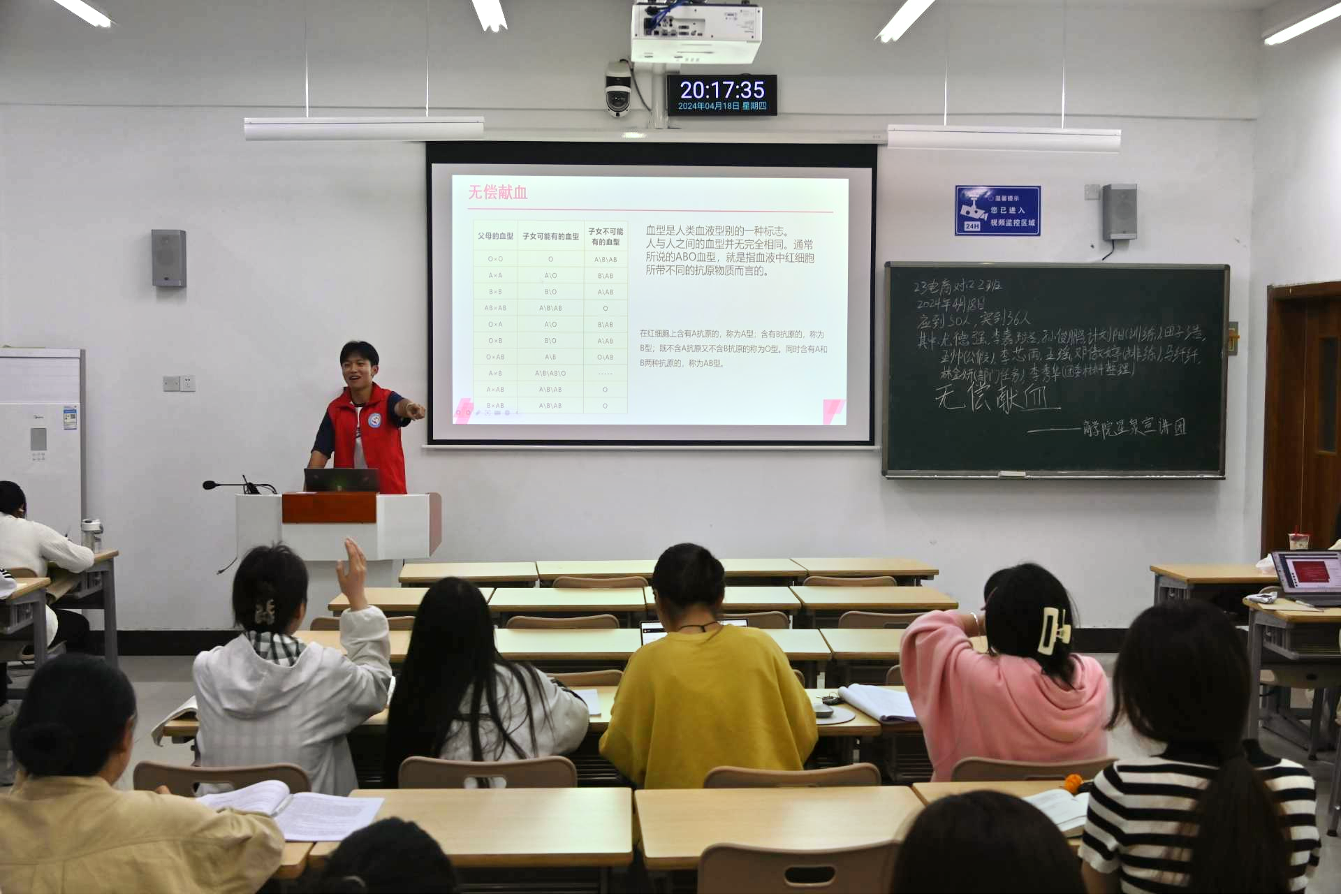 活动开始后,宣讲团成员走进每个班级,用生动形象的语言和真实感人的案例,为同学们详细阐述了无偿献血的相关知识。在宣讲过程中,同学们积极互动,现场气氛非常热烈。许多同学表示,之前对献血有一些误解,但通过此次活动,他们认识到献血不仅不会损害健康,还能在紧急情况下救助他人,因此他们将积极参与无偿献血活动。